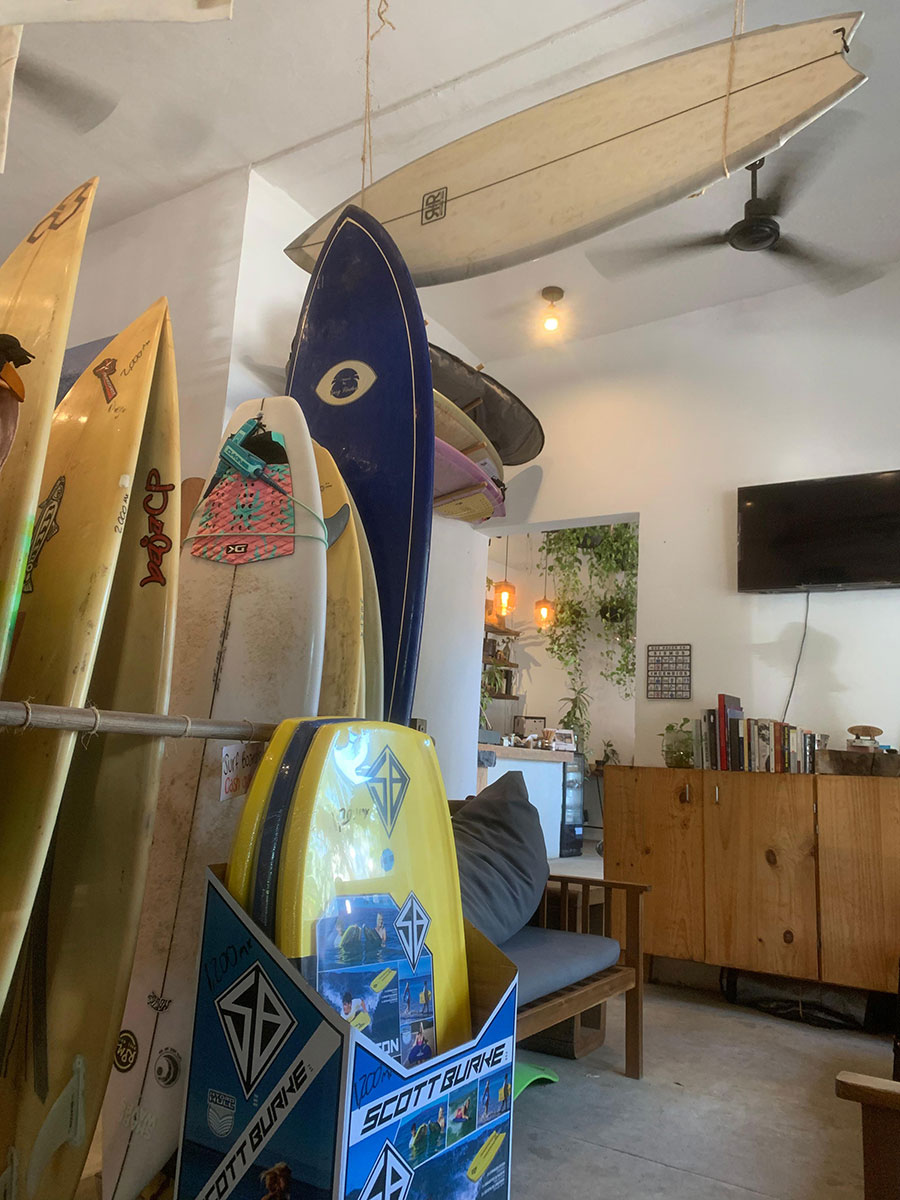 In our shop, we have a community rack where a variety of surfboards are available for sale at affordable prices. This space is designed so that residents of San Pancho can display their boards and sell them.